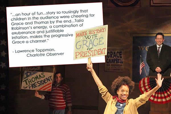 One day in class, Grace Campbell discovered there has never been a female president. “Where are the girls?” she asked, as her third-grade teacher rolls out a poster of all 44 U.S. presidents. Frustrated by the lack of female faces in the White House, Grace decides she wants to be president and inspires a school election. She seems the likely winner until the most popular boy runs against her. Through the throes of campaigning and pep rallies, service projects and posters, Grace and her classmates discover what it takes to be the best candidate and find the fun and hilarity in the wonderful world of politics!